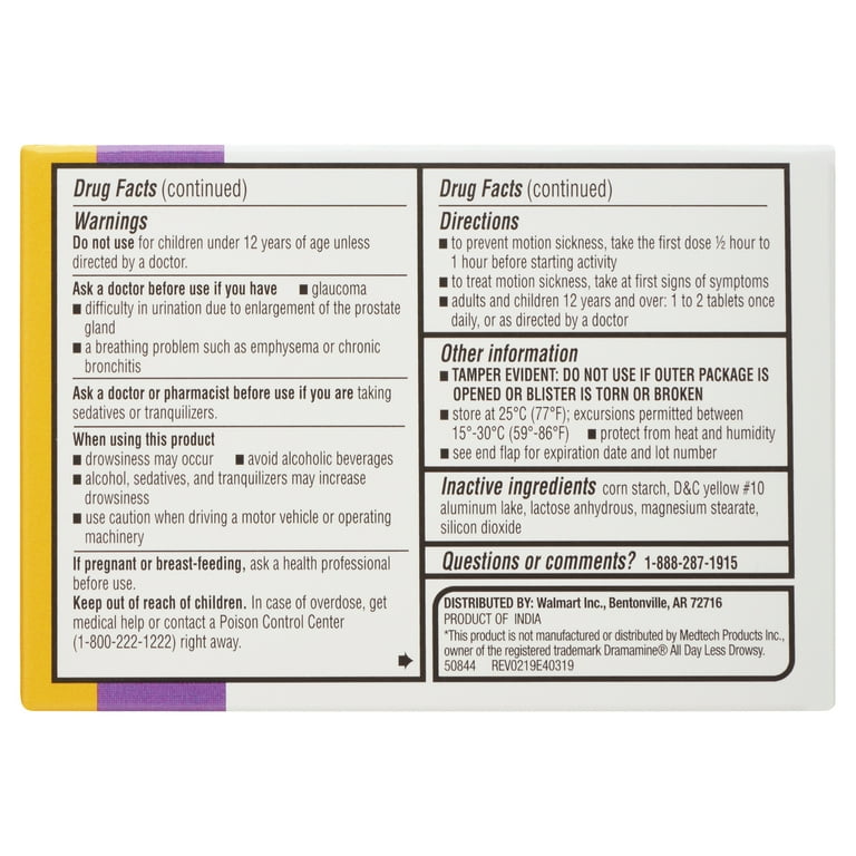 Equate Less Drowsy Formula Motion Sickness Relief Meclizine HCI